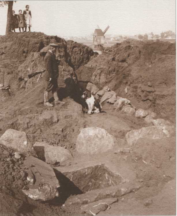 Südöstlich von Latdorf, mitten in der Feldflur, liegt der Grabhügel "Pohlsberg". Unterlagert von einer mächtigen Kiesschicht, war diese künstliche Aufhöhung schon im 19. Jh. vom Kiesabbau bedroht. So ergab sich im Jahre 1904 eine teilweise Ausgrabung des Hügels unter der Leitung von Paul Höfer (Wernigerode) (Abb. 1 und 2). Durch seinen Ausgrabungsbericht sind wir heute relativ gut über die Eingriffe informiert. Besonders hervorzuheben sind die zu dieser Zeit nicht selbstverständlichen Schichtbeobachtungen (Stratigraphie), die Höfer in einem Plan veranschaulichte. Genau diese Beobachtungen trugen wesentlich zur Klärung der zeitlichen Abfolge der Fundkomplexe bei, denn damals war die chronologische Gliederung archäologisch nachweisbarer Perioden und Kulturen durchaus noch unklar. Abb. 1 Beim Freilegen einer trapezförmigen Steinsetzung am "Pohlsberg" (1904). Jagdaufseher Theistler besucht die Ausgrabungen auf dem "Pohlsberg"Â (1904). Blickrichtung Nordwesten. Abb. 2